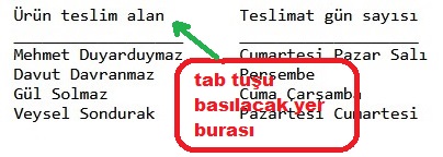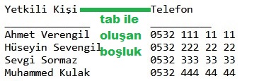 TXT dosyasında tab tuşu kullanarak aynı hizadan başlamıştık. Bu aşamada hizalamayı bize program otomatik yapıyor. Örneğin A sütunu yetkili kişi sutunudur.