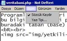 Anlamanız cep çakısı gibi olursa lazım olduğu an direkt kullanılır. Notepad.exe ile veritabanı anlama çalışmasını yaparken: Biçim menüsünden "Sözcük Kaydır" seçili olmasın. Seçiliyse tıklayıp o seçililiği kaldırın. Tab tuşu ile de musteri tablosunun sonraki alanlarına geçiş yapın. Tablomuzun alanları sırasıyla yetkili kisi, telefon, teslim alan, teslim gun, aldigi urunler.